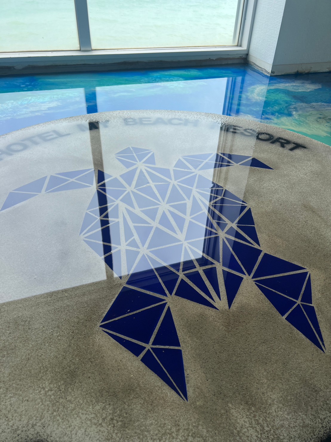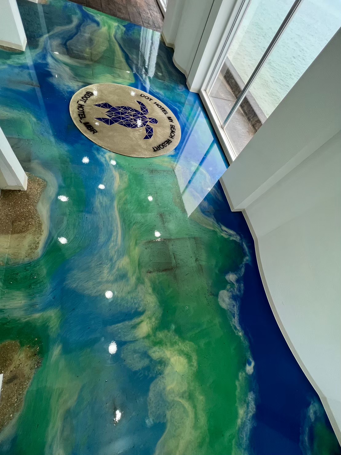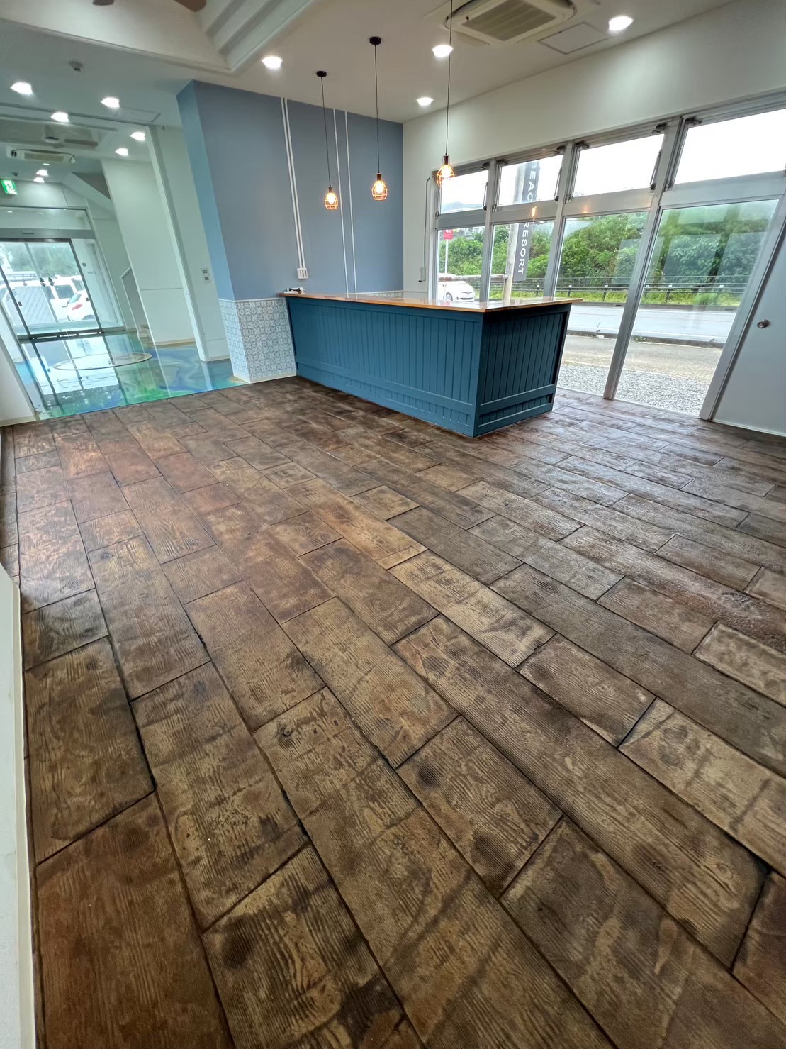 1階ホールには造作カウンター、タイルとレジンで海と亀。